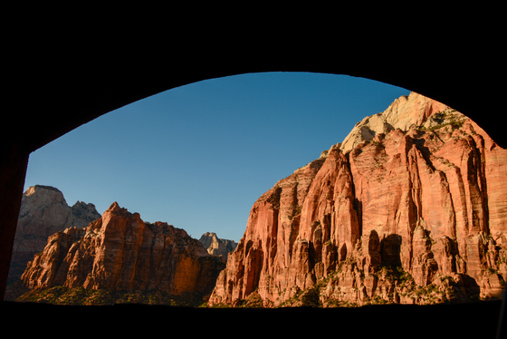 Driving through Zion's historic Mt. Carmel highway tunnel with my family, I got lucky and was able to capture the park in the late afternoon light through the gallery. We did _not_ stop in the tunnel so I could take this photo.