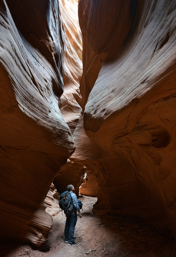 "Hiker in Happy Slot Canyon." San Rafael Desert (BLM) Near Hanksville, Utah.
