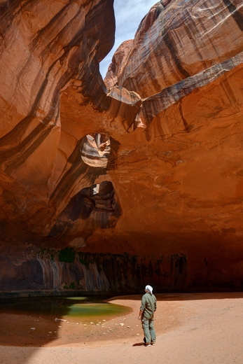 "Hiker and the Golden Cathedral in Neon Canyon." Glen Canyon National Recreation Area, Utah.