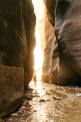 This was taken on the upper part of the narrows at Zion National Park. We had a permit to hike from the top down, a long 16 miles in freezing water but it was one of the most incredible hikes I have been on! Late afternoon the sun started to peak through the steep canyon walls and illuminate the water creating a gorgeous warm glow.