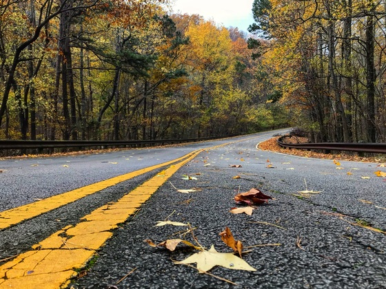 Autumn leaves on a winding road on the Talimena National Scenic Byway.