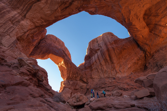 Looking up at Double Arch shortly before sunset. The people in the foreground help show just how big the arches really are.