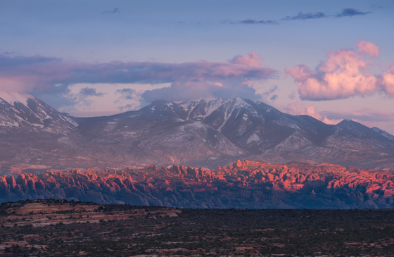 This image was taken near Plateau Viewpoint in Labyrinth Rims/Gemini Bridges Special Management Recreation Area. It shows a beautiful March sunset painting the sandstone domes of Sand Flats Recreation Area and the forested slopes of the Manti-La Sal National Forest.