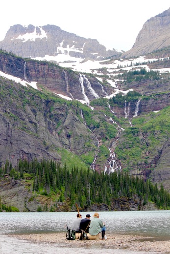 Three fishermen at Grinnell Lake, with Grinnell Glacier rising in the background.