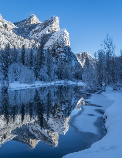 A near perfect reflection of the morning sun kissing the peaks of the Three Brothers after a snowy week in Yosemite Valley.