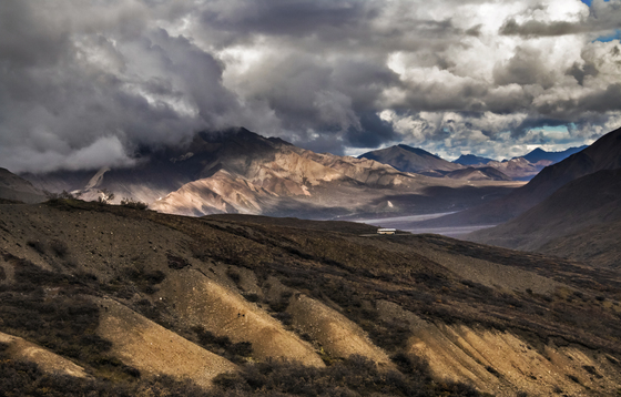 One of the few tour buses that travels inside vast tundra and mountainous landscape of Denali.