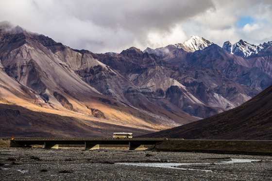 One of the authorized tour buses that travels the mountainous and vast Denali National Park.