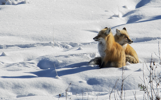 Foxes run off a carcass by a coyote look on for a bit before wandering off.