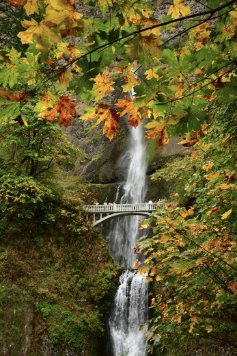 The Multnomah Falls are an icon in the Columbia River Gorge. This photo was taken in the fall before the Eagle Creek fire, when it was still green and lush.