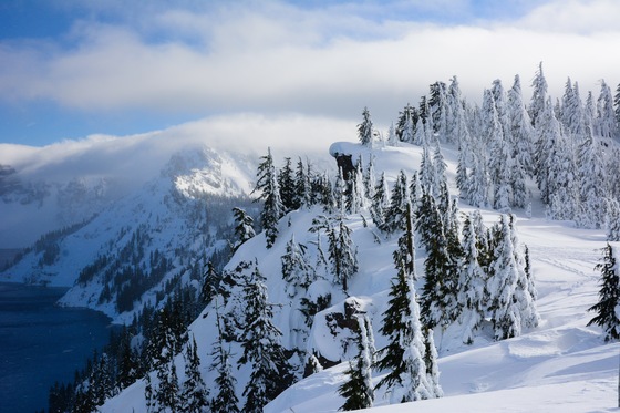 Winter is the best season to visit Crater Lake in Oregon. The snow can get over 40 feet high at the visitors center, which makes an excellent winterscape and snowshoeing adventure. This photo was taken on New Years Day in the bitter cold with subzero windchill.