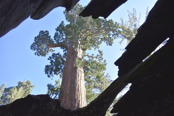 Contrast of living and dead. Peering up at a giant sequoia from within a fallen dead sequoia.