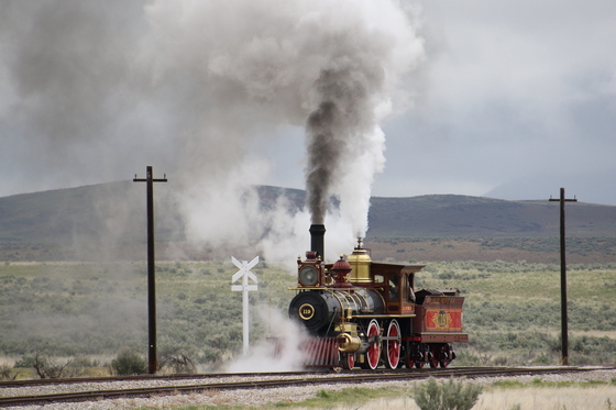 119 is a replica of the train that traveled from Ohama, Nebraska to Utah to meet Jupiter traveling from California on the transcontinental railroad. A golden spike was hammered into the railroad at this site in Utah where the two trains met. 119 is coal powered and was heading into its night time storage area in this photo.