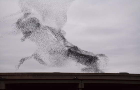 Thousands of starling birds performing murmuration with their incredible dance in so many different formations over Yolo Bypass Wildlife Area. They move so fast and each second was a completely different formation. Their speed, movements, motions, turning and twisting without colliding with each other was the most impressive part. This shot was taken at dusk on a cloudy day. Do you see a fox of birds?
