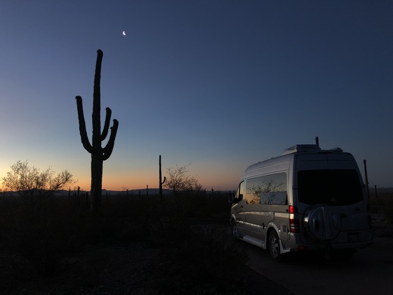 While visiting Organ Pipe Cactus National Monument, I had gotten up early to watch the sunrise and the sliver of the moon above at the RV Campsite on May 10, 2018. Looking from behind the RV to the right and the Organ Pipe Cactus to the left both in silhouettes was all it took to say "This is the Organ Pipe Cactus National Monument".
