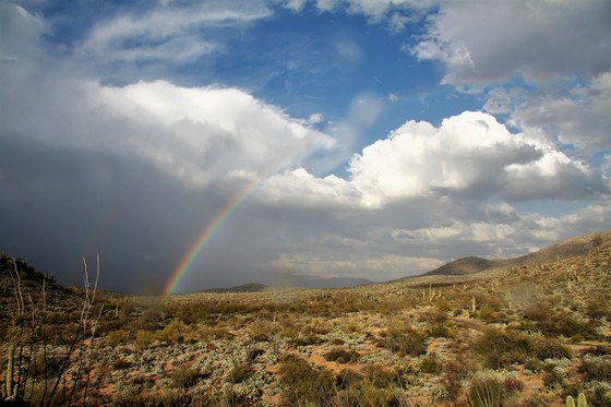 A double rainbow arcs across the desert in the eastern segment of Saguaro National Park.