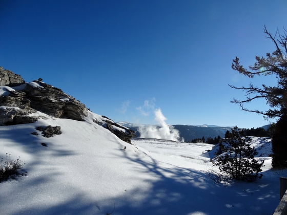 Steam rising from Mammoth Hot Springs in Yellowstone National Park. It was 58 degrees F. and sunny in the middle of December--a lovely time to visit Yellowstone. Not crowded, either!