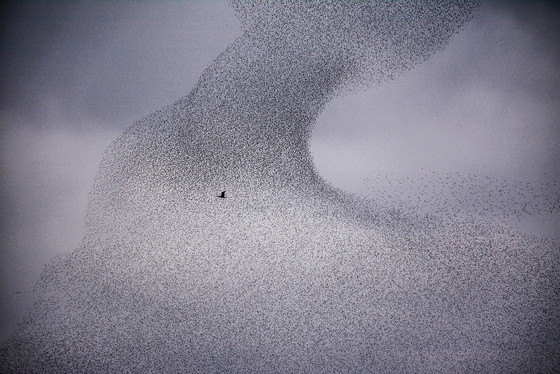 An incredible formation from thousands of starling birds from the sky above. Almost like a tornado going to touch down with many birds. Seeing thousands of starlings flying together in a whirling pattern is a rare phenomenon of nature that delights those lucky enough to experience it. The speed, movements, motions, and formations all connected together and work in a remarkable team effort without colliding with each other.