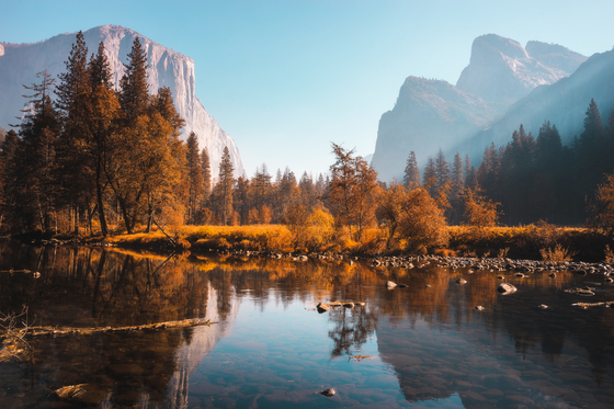 Valley view floor at Yosemite National Park - El Capitan in the distance towers high above on a cool fall morning
