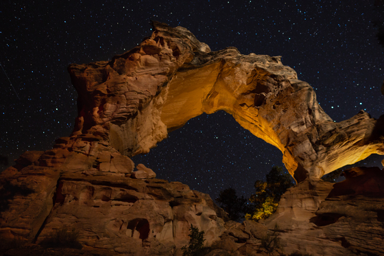 Inchworm Arch under starry skies being lite with low intensity lights. A gorgeous area that was discovery by a boy scout troop