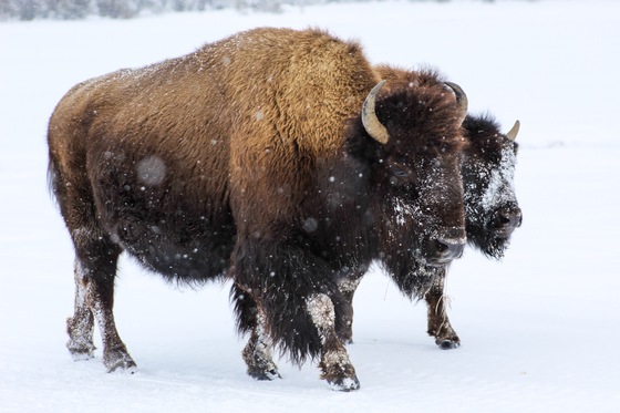 Adult female bison and calf walking in the snow at Yellowstone National Park.
