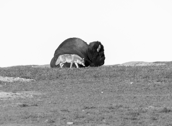 Partial Eclipse - Two coyotes approached this old bull bison from opposite directions. At the last minute one of the coyotes turned around, but this one continued slowly walking past the old bull!