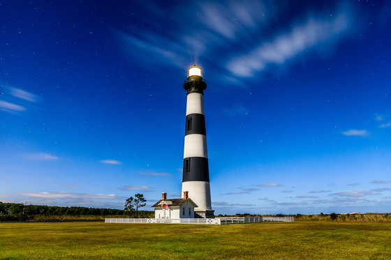 Bodie Island Lighthouse in the Moonlight I arrived at Bodie Island Lighthouse at night to capture the sunrise image. While I was waiting for the first light in the middle of the night, I found the lighthouse was pretty bright because of the full moon. I was curious how it looked in the photo. I used very slow shutter speed to get enough exposure. The lighthouse shining in the moonlight is incredible beautiful with moving cloud and stars. This attempt is more successful than the sunrise photo.