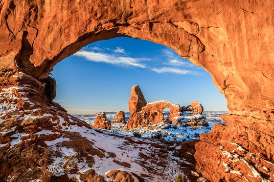 Arch in the Arch A few days after the Dec 20, 2017 snow storm in Utah, I came to the North Window Arch in Arches National Park to photograph the view of Turret Arch through North Window with snow as add-on interesting element. The rising sun was blocked by clouds. I waited patiently until sunlight went through the clouds and the sandstone was finally. I was so excited to capture such a magic moment.