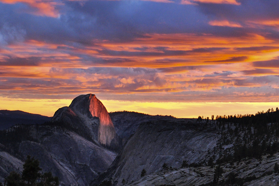 One of the most amazing sunsets we'd ever seen. The sky was on fire and the face of Half Dome was glowing orange. The view from Olmsted Point couldn't have been more incredible