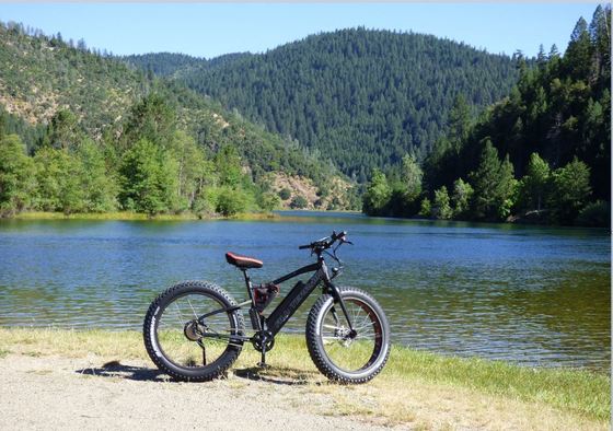 Lewiston Lake view looking south from Pine Cove with all terrain electric bike in foreground.