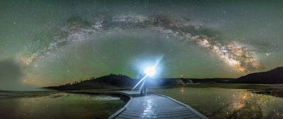This was shot at Grand Prismatic Spring boardwalk. This place was suggested to me by Manish Mamtani and it's a wonderful location. All the green color you see in the image is natural airglow. The milky way was so stunning that I could see the reflection with my naked eyes. Be careful if you go to this place at night, it can get chilly all of a sudden and the path starts getting iced over and slippery. Pack boots and warm clothes even in summer.