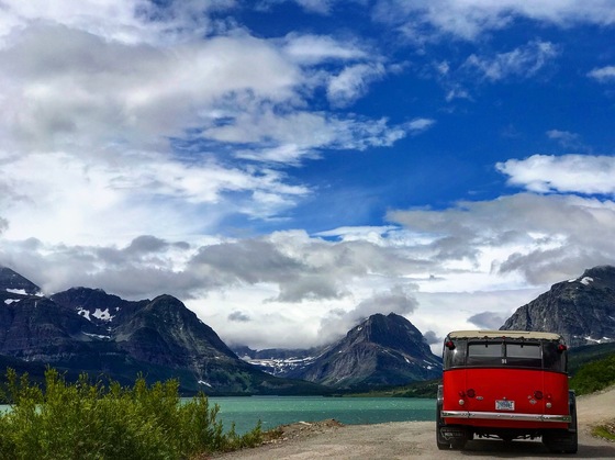 A famous ‘Glacier Red Bus’ touring alongside the electric blue Lake Sherburne.