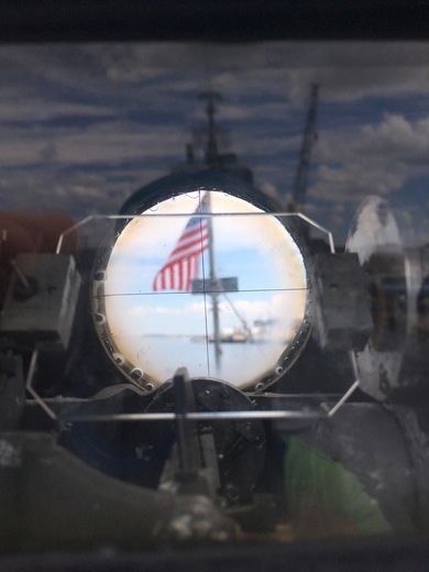 Looking through the gun scope on the U.S.S. Cassin Young with reflection.