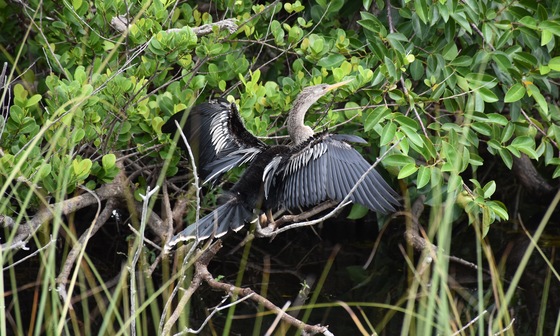 The anhinga has wings that are not waterproof and they need to be dried out frequently. Some people describe the wings as looking like the keys of a piano.