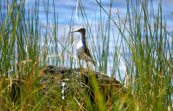 A Female Semipalmated sandpiper protecting her young on a rock near her nest.
