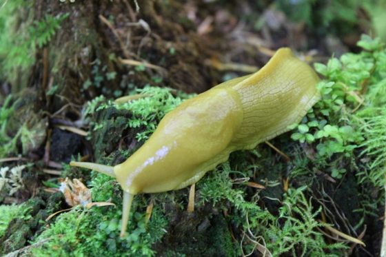 A banana slug crawls through moss on a gigantic redwood stump.