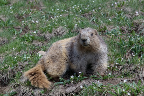 This Olympic marmot was enjoying a beautiful spring day on Hurricane Hill. The spring beauty wildflowers were out en force, and he enjoyed snacking in the sunshine.