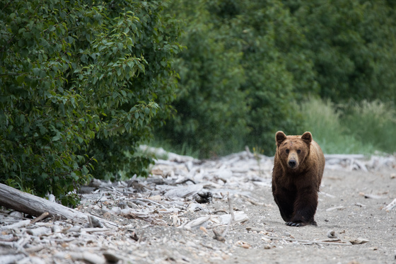Brown bear 151 "Walker" in Alaska's Katmai National Park walks along the beach at Naknek Lake.