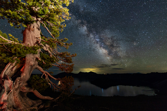 Milky Way over Crater Lake. Mars is seen through the branches as well as its reflection off the lake. The tree was lit by a passing vehicle.