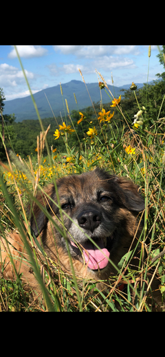 My beautiful 14 year old dog Rennie, in the gorgeous meadow at Moses H Cone Memorial Park- on a hike up to the fire tower. We will always remember this trip on the BRP- so very magical❤️