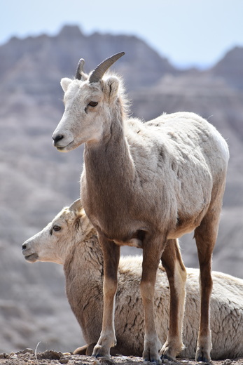 Two bighorn sheep on a cliff overlooking the Badlands