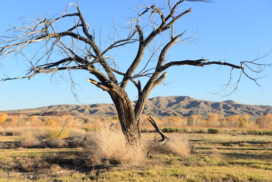 An old tree against a mountain backdrop at Bosque Del Apache National Wildlife Refuge