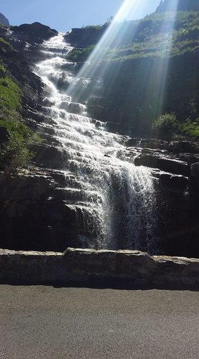 As my wife and I were driving up the Going to the Sun Road on our motorcycle, she took this picture of a waterfall and only later did we see the light shining over it.