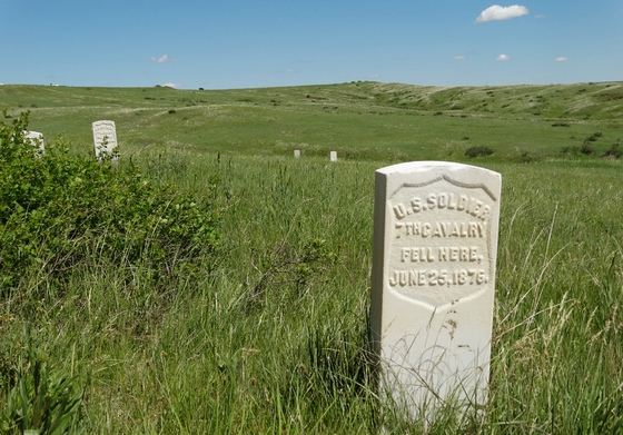 Custer's Last Stand. White military markers show where cavalrymen left their mark in one of the most memorable battles in America's history. Time has shifted the grains of dirt beneath them, causing the markers to lean a bit to the left or right, depending on the terrain.