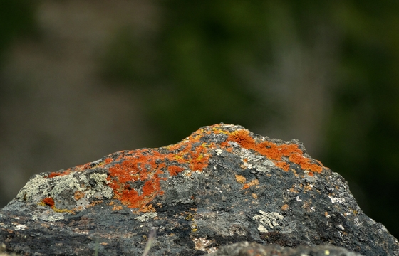 I saw this crustose lichen growing on big rocks on the downward rocky slope of a mountain at 10,100 feet above sea level, alongside the scenic Beartooth Highway in northwest Wyoming. This type of lichen grows at high alpine elevations; and, it's known to be slow-growing and long-lived. Most crustose lichen grow only 1-2 mm. in diameter every year, in fact (and, since it takes 25.4 millimeters to make up an inch, that's pretty slow-growing).
