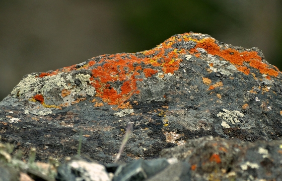 I saw this crustose lichen growing on big rocks on the downward rocky slope of a mountain at 10,100 feet above sea level, alongside the scenic Beartooth Highway in northwest Wyoming. This type of lichen grows at high alpine elevations; and, it's known to be slow-growing and long-lived. Most crustose lichen grow only 1-2 mm. in diameter every year, in fact (and, since it takes 25.4 millimeters to make up an inch, that's pretty slow-growing).