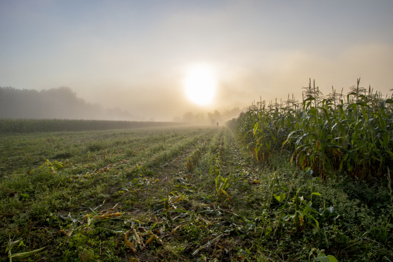 A Szalay's Farm corn picker works on a foggy summer morning.