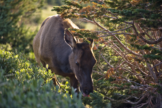 A mother elk stops for a quick meal while her fawn waits nearby in Rocky Mountain National Park.