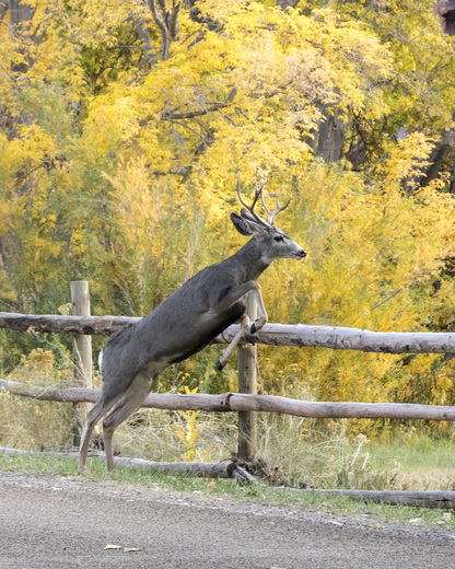 A buck effortlessly leaps over a rail fence to get to his harem feeding on the other side.
