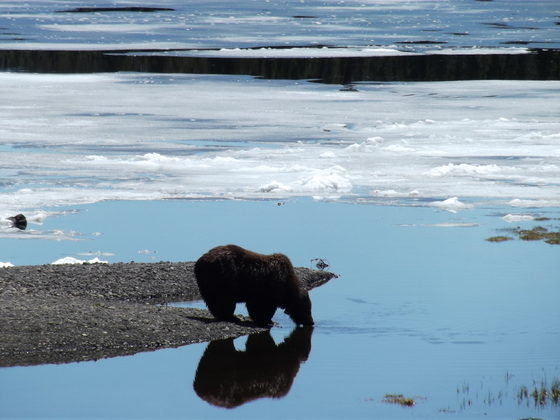 Grizzly bear quenching his thirst at Yellowstone Lake.