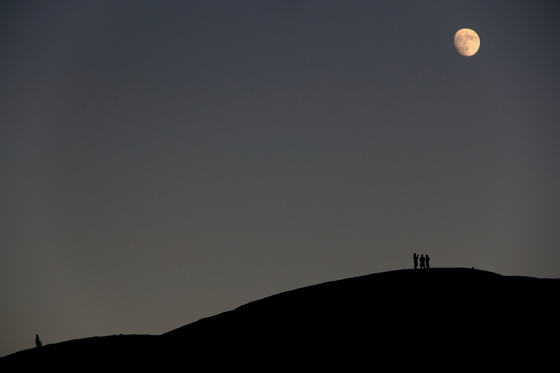 An early night shot looking up at Zabriskie Point from the trail to Golden Canyon, with the rising moon in the background.